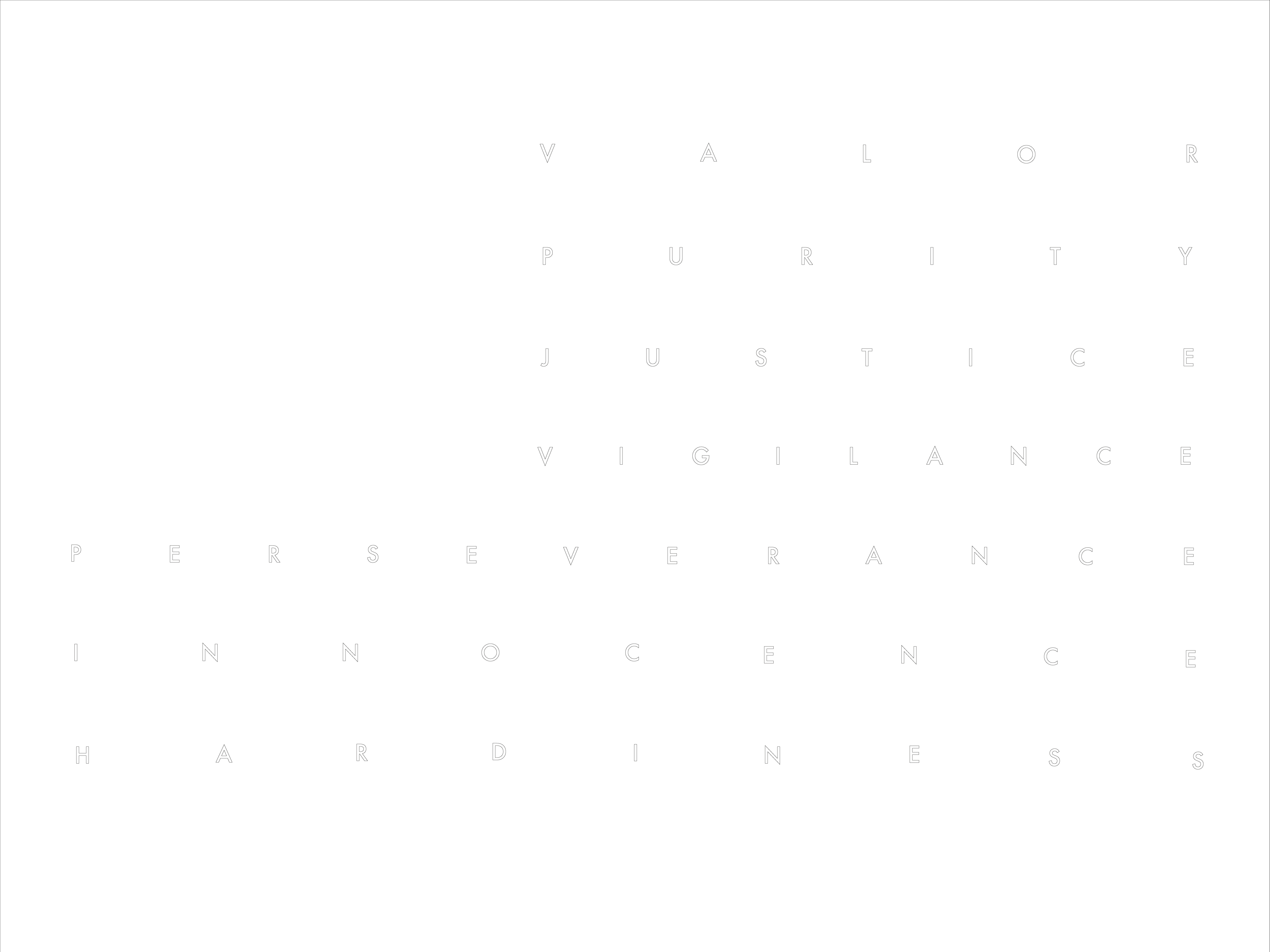 Von den insgesamt dreizehn charakteristischen Stripes der Flagge sind in jeden zweiten die Worte Justice, Perseverance, Innocence, Hardiness, Valor, Purity und Vigilance eingraviert. Diese Begriffe, traditionell mit Tugenden und moralischen Idealen verbunden, repräsentieren die ursprünglichen Farben Weiß, Rot und Blau. Doch anstelle leuchtender Symbolik wirken sie hier wie eingekerbte Mahnmale – ihre Bedeutung ist nicht aufgehoben, sondern in Frage gestellt.